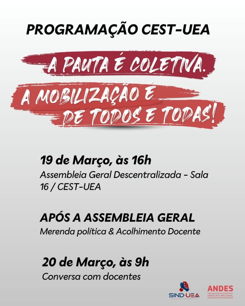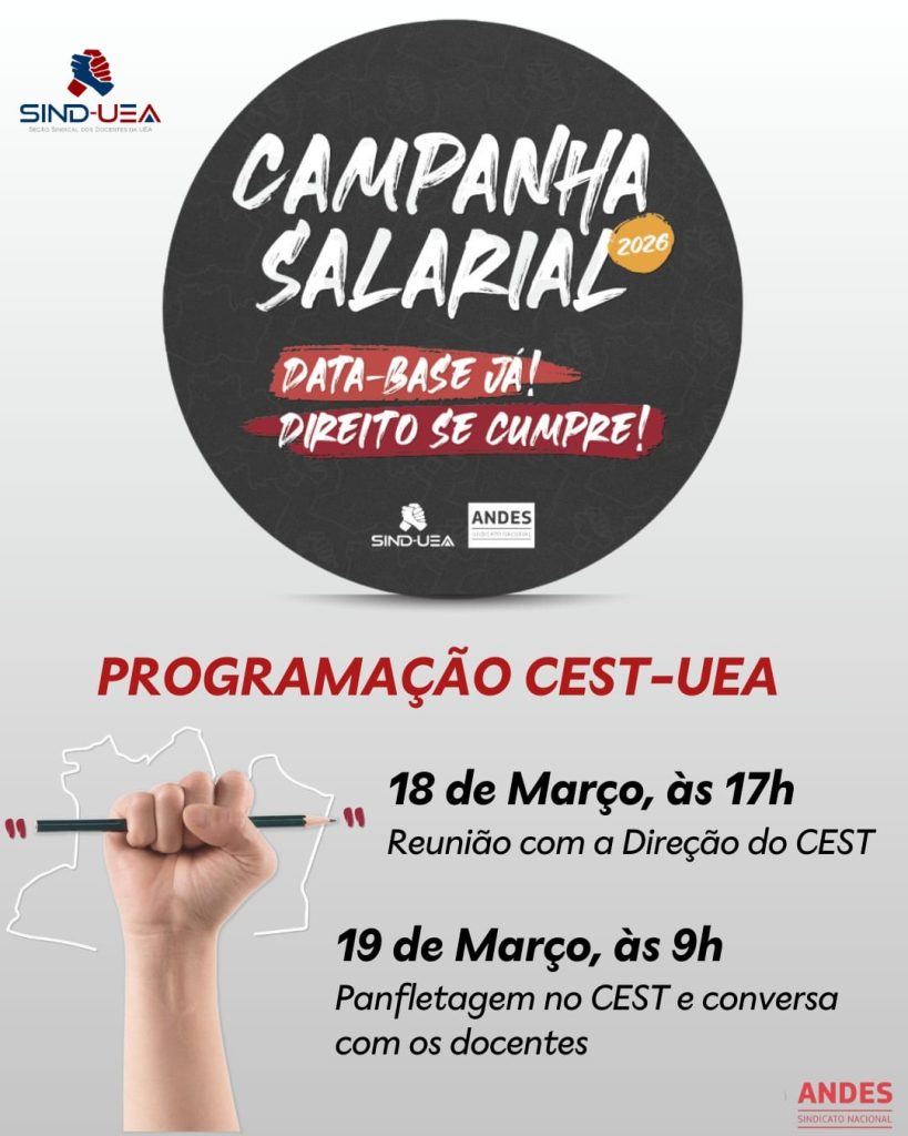 Para enfrentar esse cenário, a Sind-UEA está realizando a Campanha Salarial 2026, reforçando a mobilização da categoria em defesa da valorização docente e do cumprimento da legislação. E neste 18 de março, chegaremos ao Centro de Estudos Superiores de Tefé – CEST.