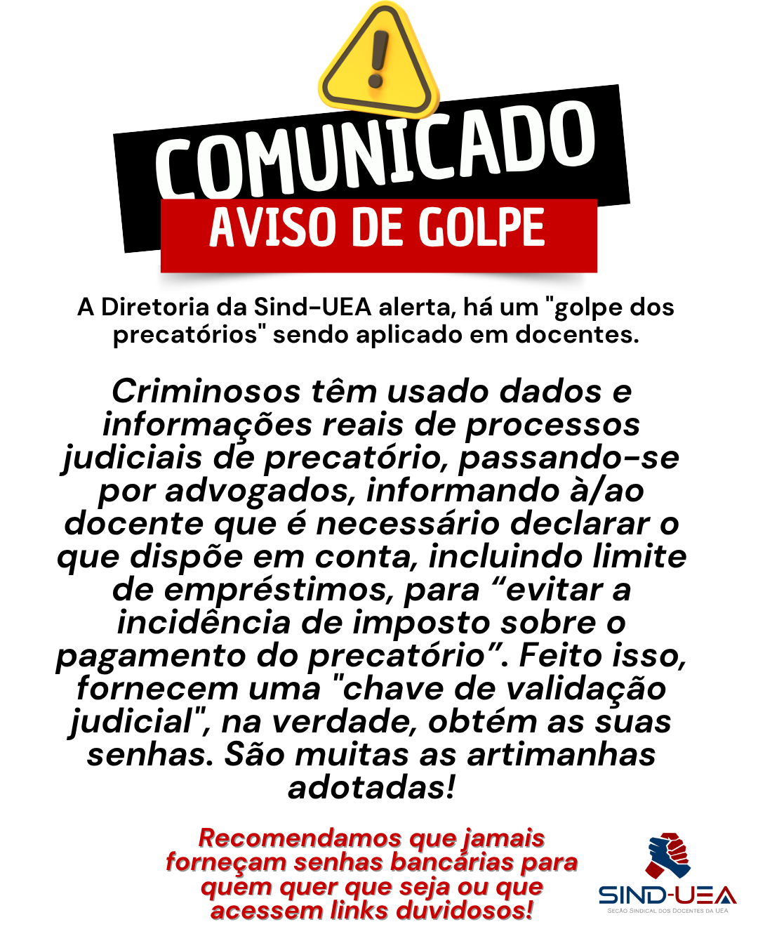 Criminosos têm usado dados e informações reais de processos judiciais de precatório, passando-se por advogados, informando à/ao docente que é necessário declarar o que dispõe em conta, incluindo limite de empréstimos, para “evitar a incidência de imposto sobre o pagamento do precatório”. Feito isso, fornecem uma “chave de validação judicial”, na verdade, obtém as suas senhas. São muitas as artimanhas adotadas!Recomendamos que jamais forneçam senhas bancárias para quem quer que seja ou que acessem links duvidosos!