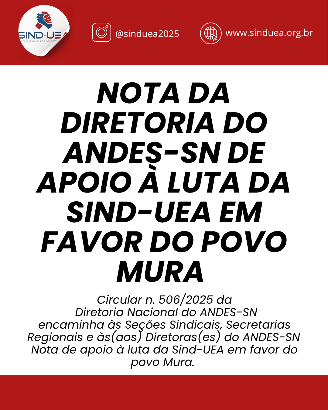 Prezadas Sindicalizadas/Prezadas Sindicalizados,Recebemos com ânimo a importante nota de apoio do ANDES-SN à luta da Sind-UEA em favor do povo Mura. Continuaremos atuando ativamente pela revogação dos acordos de cooperação celebrados entre a UEA e a empresa de exploração mineral Potássio do Brasil.